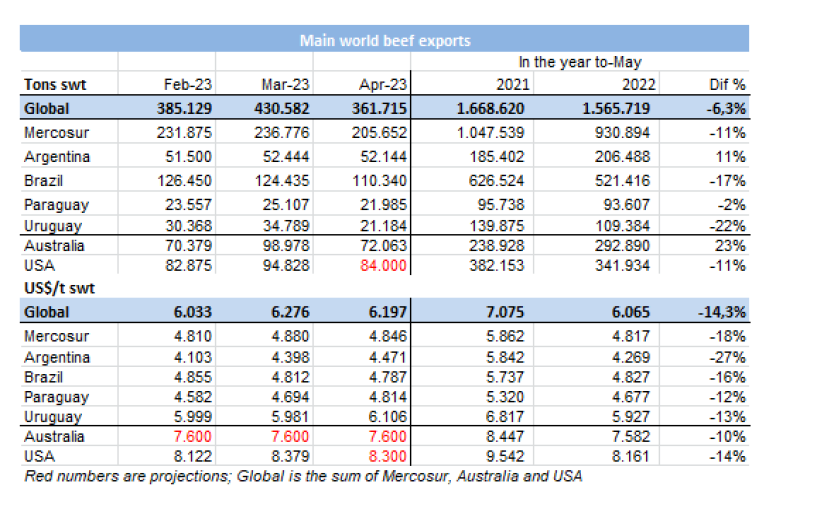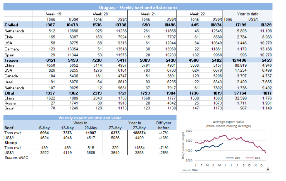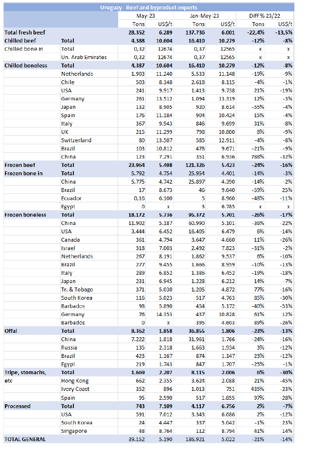 根據(jù)海關(guān)數(shù)據(jù),2023年1-5月,烏拉圭牛肉累計出口達13.8萬噸,同比減少22%。均價同比降低了14%,至每噸$6001。