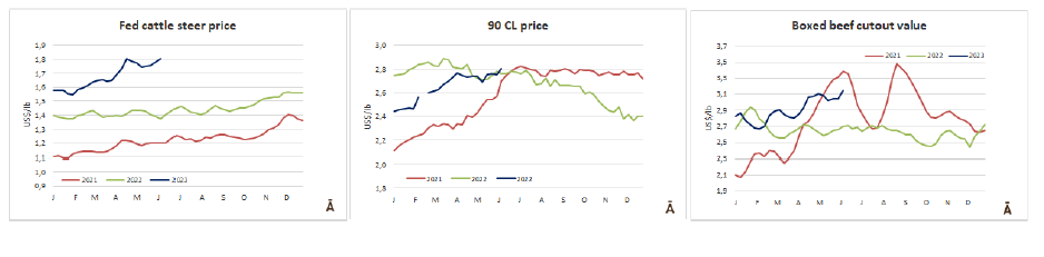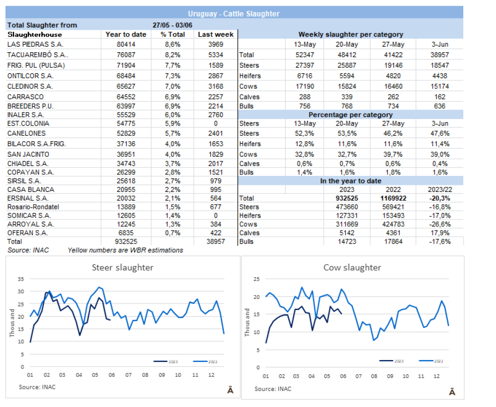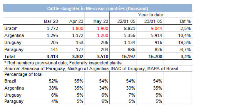 5月份,有206,164頭牛被屠宰,比2022年同月少了近42,000頭(-17%)。今年前五個月累計共屠宰了915,955頭牛,比2022年同期減少219,000頭(-19%)。