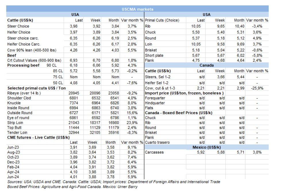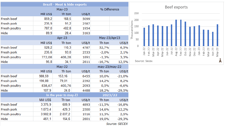 外貿(mào)部報告稱,5月巴西出口了168,510噸牛肉,出口額8.59億美元,均價為每噸$5099。由于往中國出口更加順暢,與4月份相比,數(shù)量增長了53%(超過5.8萬噸),均價回升了6.5%。是2022年10月以來最大出口量。
