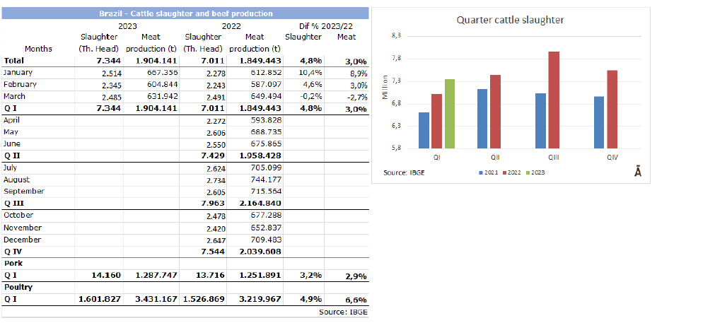 根據(jù)巴西地理和統(tǒng)計局昨天發(fā)布的詳細報告顯示,2023年第一季度中巴西屠宰??偭繛?span>734萬頭,同比增加4.8%。由于胴體均重下降了4.5%,達到259.3公斤,牛肉產(chǎn)量較去年增加了3%達到185萬噸。