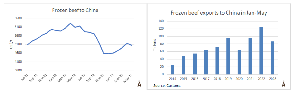 截至到今年5月,烏拉圭出口到中國的冷凍牛肉量下降36%