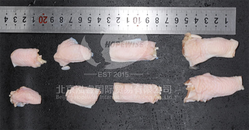 現(xiàn)在不用這么麻煩了,我們泓睿有現(xiàn)成分割好的雞腳筋——紅太陽雞腳筋。每包重2kg,解凍后去除冰水,剩余凈重1.86kg,失水率約7%。
