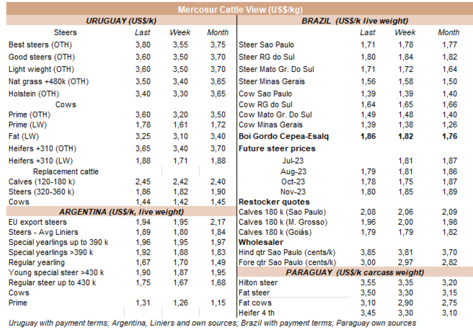 世界牛肉報(bào)告顯示過去一周南方共同市場(chǎng)閹牛價(jià)格上漲4美分至3.37美元/公斤。牛肉屠宰量增加,烏拉圭上漲了7%,巴拉圭上漲了6%,阿根廷市場(chǎng)保持穩(wěn)定,而巴西出口平均數(shù)減少了1%(-3美分)至每公斤3.08美元。雷亞爾對(duì)美元的升值(+1%)阻止了該地區(qū)牛價(jià)格的進(jìn)一步下跌。