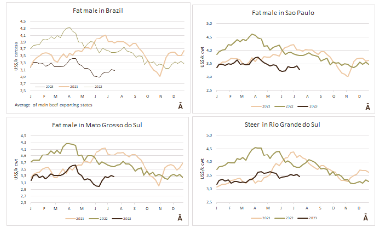 根據(jù)巴西環(huán)境與分析研究所上周發(fā)布的數(shù)據(jù)顯示,由于季節(jié)性調(diào)整,5月份的零售額比4月收縮了1%。與2022年5月相比,零售額也下降了1%,遠(yuǎn)低于分析專家關(guān)于1.6%復(fù)蘇的預(yù)期。預(yù)計(jì)7月份出口量將低于16萬噸。上周牛肉出口達(dá)到3.925萬噸,周增長(zhǎng)5.01%。7月前十個(gè)工作日,牛肉出口約7.663萬噸,平均0.766萬噸/天,比2022年7月的日均水平低3.72%。Agrifatto稱:“通常情況下,前兩周的出貨量是最大的,7月迄今為止的統(tǒng)計(jì)數(shù)字表明,本月16萬噸的出口預(yù)期很難完成。