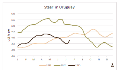 據(jù)INAC報(bào)道,6月份公牛2.0的價(jià)格為1497美元/噸,比5月份的 1610美元/噸降低了7%。肉類價(jià)格的下將的原因是出口產(chǎn)品、國(guó)內(nèi)市場(chǎng)的胴體、以及內(nèi)臟和副產(chǎn)品的價(jià)格的下降