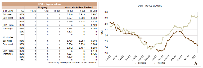 與前一周相比,進(jìn)口牛肉價(jià)格大幅下跌,交易適中。較低的進(jìn)口價(jià)格使其對(duì)進(jìn)口商更有吸引力。根據(jù)美國(guó)農(nóng)業(yè)部的每周報(bào)告,盡管有價(jià)格優(yōu)勢(shì),但一些最終用戶仍然不愿轉(zhuǎn)向肉類進(jìn)口。