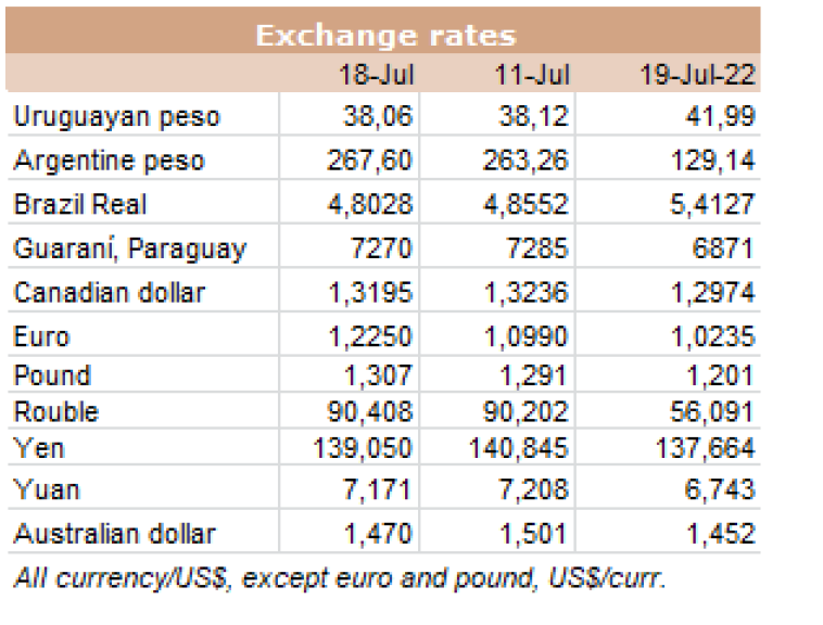穿越山脈的運(yùn)輸仍很艱難,不確定性導(dǎo)致工作很困難。據(jù)估計(jì),大約有300輛卡車還沒過境,其中大部分是來自巴西的牛肉。近期將會(huì)有很牛肉產(chǎn)品到貨,但是有效期已經(jīng)差不多過半(45%-55%)。這使得牛肉業(yè)務(wù)非常復(fù)雜,從烏拉圭進(jìn)口的19分體價(jià)格為5200-5300美元CIF/噸,其他則達(dá)到5500-5700美元/噸。