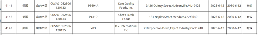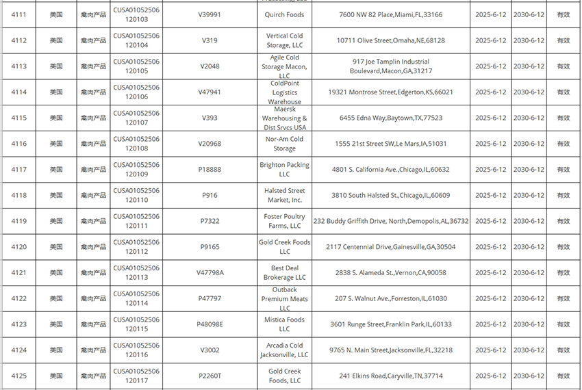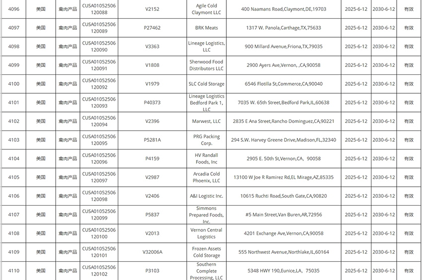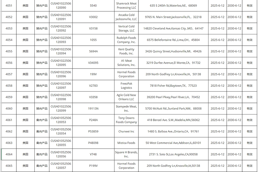 新增美國(guó)豬肉、禽肉企業(yè)自2025年6月12日及之后生產(chǎn)的符合中國(guó)要求的肉類產(chǎn)品輸華。其中83家禽肉企業(yè),23家豬肉企業(yè)。