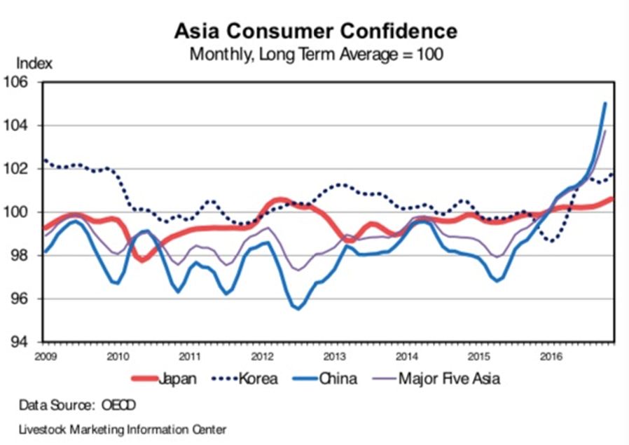 第三張圖表是亞洲消費(fèi)者信心指數(shù)的總結(jié)。總體上而言,亞洲消費(fèi)者信心在2017年急速上升,中國(guó)最為迅速。南韓也高于100的指數(shù)水平。日本的消費(fèi)者信心緩慢的接近100。此處,主要的五個(gè)亞洲國(guó)家數(shù)值是中國(guó),日本,印度尼西亞和南韓的綜合指數(shù)。