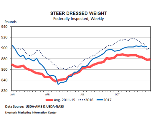 2017年生豬屠宰量依然跟隨著季節(jié)性模式。在2017第四季度年同比增加也是通常的典型情況,并高于同期前幾個月水平。11月和12月上半月溫和的中西部天氣能有利于提高育肥重量。生豬重量在2016年年底出現(xiàn)異常,年同比并沒有增加(或者說是相較于前5年的平均水平也沒有增加,請見圖表)。