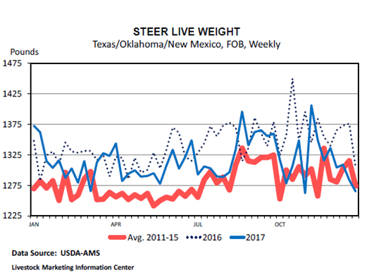 根據(jù)最新數(shù)據(jù),牛的育肥重量在2016年最終有一次上浮,部分原因是從11月到12月溫和的天氣。作為提醒(在今天日報里的一個部分也提及到),2017年年初育肥牛的重量年同比下降不能都?xì)w結(jié)為惡劣的天氣。積極擴(kuò)張的市場營銷也導(dǎo)致了這些下跌。但12月底幾個主要育肥場的所在地區(qū)天氣發(fā)生改變,極度寒冷的天氣突然到達(dá)美國中西部和一些其它地區(qū)。后附兩張育肥牛重量趨勢圖片相比, 顯然12月的年同比重量增加主要是在中西部和中部平原地區(qū)。近期極端寒冷的天氣主要集中在美國中部,預(yù)計國家育肥牛重量數(shù)據(jù)能很快體現(xiàn)出來。