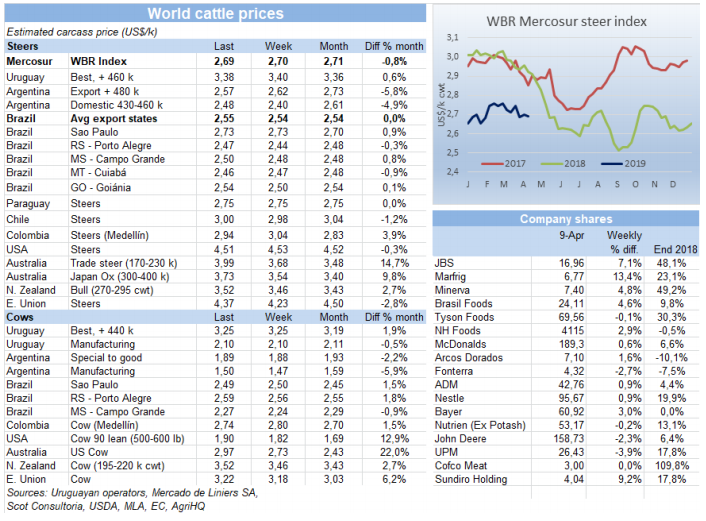 中國市場依然很活躍,對全部位肉和副產(chǎn)品都有需求,但是目前報(bào)盤很少,有些屠宰廠甚至都賣到六月了,很難拿到報(bào)盤。烏拉圭業(yè)內(nèi)人士認(rèn)為這主要是因?yàn)檫M(jìn)口商從年初就非常積極采購,而國內(nèi)屠宰廠對后期能否保持屠宰節(jié)奏有疑慮,也無法預(yù)測活牛成本是否會(huì)上升,烏拉圭肩胛背肩4600,小條6500,羊胴體價(jià)格也保持穩(wěn)定,18-25公斤3900,25-35公斤3500。另一方面香港市場開始有反應(yīng),巴西腱子跟幾周前比漲了400美金,目前3500-3600,工廠后面要3700-3800。