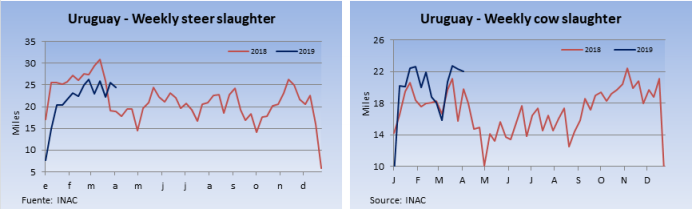 上漲的主要是面向國內(nèi)市場的待宰牛,小牛犢和小閹牛價(jià)格自年初以來漲了40%,最近由于價(jià)格回調(diào),總漲幅應(yīng)該在35%左右,年初預(yù)計(jì)出口活牛價(jià)格會(huì)上漲15%,但目前也已經(jīng)遠(yuǎn)遠(yuǎn)超過這個(gè)漲幅。雖然屠宰量還是很高,但從結(jié)構(gòu)來看屠宰增加的主要是母牛,二月屠宰量同比增加29%,而小牛犢和閹牛屠宰量減少了15%。面向本地市場的小牛犢和閹牛供應(yīng)短缺,主要因?yàn)轱曈龍隼麧櫬什蛔愣M(jìn)行存欄清盤,同時(shí)夏季良好的飼草情況也使活牛生產(chǎn)商可以等待合理的時(shí)機(jī)出售。