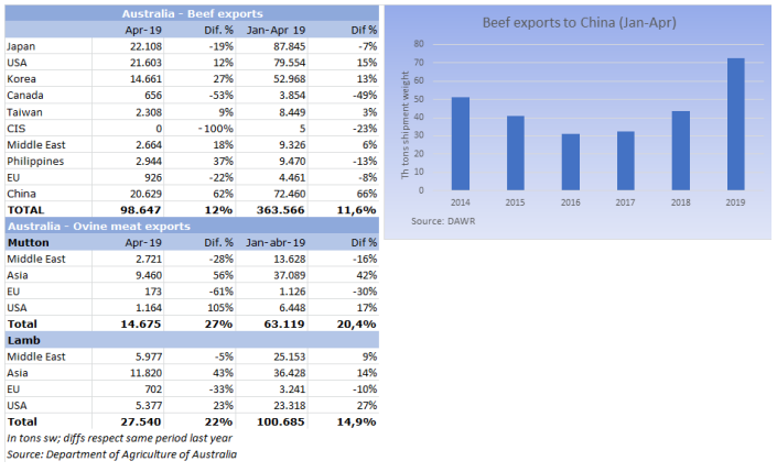 2019年前四個(gè)月澳洲對(duì)中國(guó)出口72460噸牛肉,同比增加66%,至此中國(guó)成為澳洲牛肉第三大市場(chǎng),接近美國(guó)7.96萬(wàn)噸和日本8.78萬(wàn)噸。四月澳洲共出口98647噸牛肉,連續(xù)16個(gè)月同比增加,前四個(gè)月共出口36.3萬(wàn)噸,同比增加11.6%。前四個(gè)月綿羊肉出口量也增長(zhǎng)了20%,達(dá)到63119噸,羊羔肉出口增長(zhǎng)15%到100685噸。