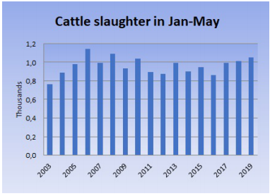跟去年同期類似,雖然牛只存欄結構預示屠宰量會下降,但實際情況正相反,需求量過大,價格很有吸引力,刺激農(nóng)牧場出欄,本周牛只屠宰量比前一周減少了2000頭,但同比還是增加3000頭,第一季度屠宰量同比減少3.5萬頭,但四五月屠宰量同比上升,截止到本周末今年共屠宰了近100萬頭,比2018年同期高了差不多2萬頭,五月屠宰量預計在22萬頭上下,遠高于去年五月的18.1萬頭。和2018年一樣,雖然育肥閹牛存欄量較低,但預期的屠宰量大幅減少這一情況并沒有發(fā)生,截止到5月25日這周共屠宰49291頭牛,其中閹牛是主要品類,達到25236頭,因為屠宰場在為7月1日開始的新481配額做屠宰。