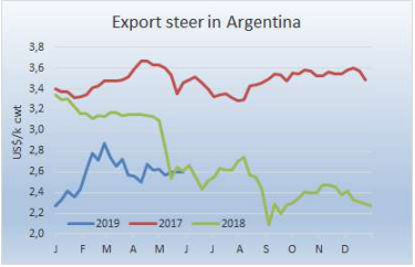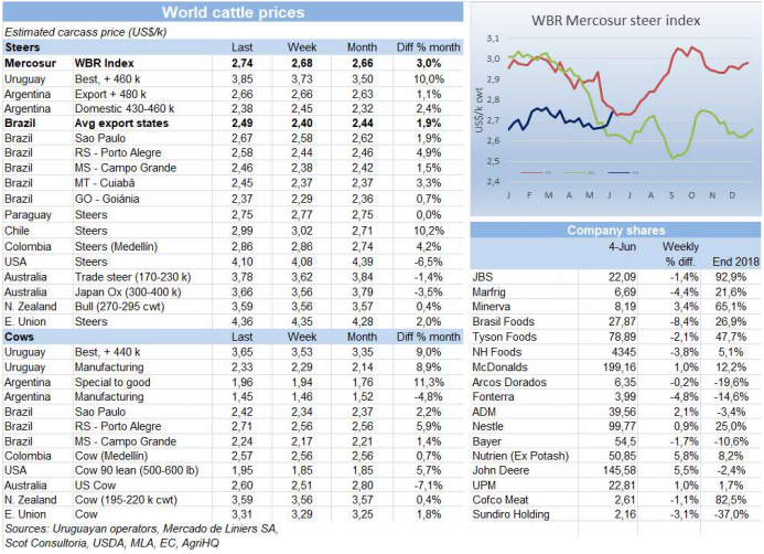 南方共同市場閹牛價格上漲6美分到2.74美金/公斤,三月中以來最高,主要驅(qū)動力來自巴西雷亞爾,雖然對經(jīng)濟增長減速有所擔憂,本周還是增值3.5%,主要出口州牛價只上漲了0.3雷亞爾/15公斤,到141雷亞爾,但換算成美金牛價上漲了9美分到2.49美金。烏拉圭活牛市場還是過熱,閹牛價格本周再度上漲12美分,比其他國家都高了1美元/公斤以上。阿根廷和巴拉圭牛價沒有變化。
