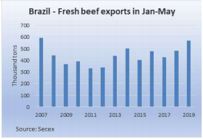 巴西牛肉出口量還在穩(wěn)步增加,由于全球?qū)游锏鞍仔枨笤鲩L,五月牛肉、豬肉以及禽肉出口量都有增加,五月牛肉出口量達到12.1萬噸,同比增加34%,均價3883美金,同比降低7.1%。前五個月巴西共出口56.7萬噸,均價3780美金,出口量同比增加18.2%,均價下跌7.4%。五月豬肉出口量5.81萬噸,2017年八月以來最高。