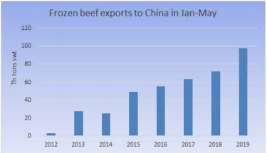 五月烏拉圭保持了強勢的出口節(jié)奏,中國還是最主要市場,總出口量31229噸,其中21075噸去中國,美國市場也進口了3412噸。前五個月烏拉圭共出口97265噸牛肉去中國,同比增加35%,屠宰量的增加也反映到了出口量上,截至五月共出口14.7萬噸,同比增加6%,均價5064美元離岸價。