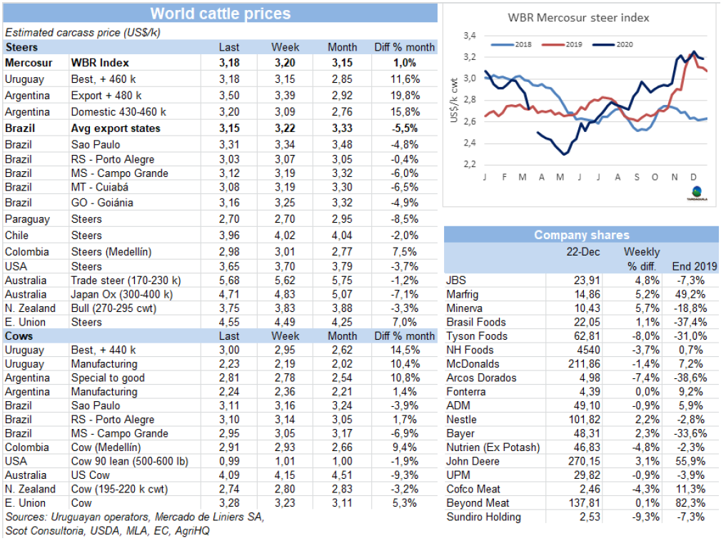 在活牛價(jià)格飆高、出口市場(chǎng)價(jià)格低迷的背景下,至少有六家工廠決定暫停圣誕節(jié)到1月4日的屠宰活動(dòng),這些工廠包括Swift,Gorina,ArreBeef,SanJorge,Frimsa和Rafaela。暫停屠宰活動(dòng)有助于維持牛價(jià),對(duì)閹牛需求的下降將有助于價(jià)格下降,通常也會(huì)在1月份發(fā)生,因?yàn)樯a(chǎn)者的供應(yīng)量將比12月份增多。