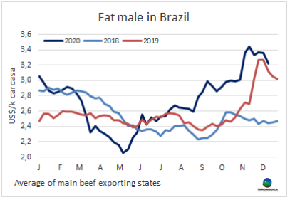 一直持續(xù)到上周三的育成牛價(jià)格下跌趨勢(shì)開(kāi)始疲軟。自11月中旬開(kāi)始,圣保羅牛價(jià)下跌了超過(guò)30雷亞爾/15公斤,約11%。本周期貨市場(chǎng)育成牛價(jià)格上漲了9-15雷亞爾/15公斤。批發(fā)市場(chǎng)帶骨牛肉銷量非常好,已經(jīng)賣到什么都不剩,這也影響了育成牛價(jià)格的預(yù)期,盡管去骨部位肉市場(chǎng)仍然沉重。圣保羅30天付款的育成牛價(jià)格本周上漲了1雷亞爾/15公斤,上漲至256雷亞爾/15公斤,其他活牛市場(chǎng)周變化大部分是下降的,但圣保羅市場(chǎng)的堅(jiān)挺應(yīng)該會(huì)在未來(lái)幾天對(duì)其他州產(chǎn)生影響。