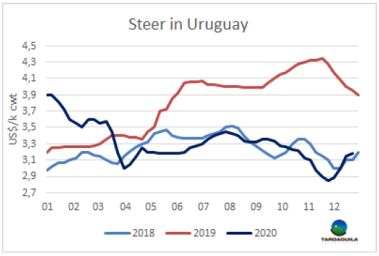 11月平均閹牛類型價(jià)值下降至1094美元/頭,較去年12月達(dá)到的最高值下降了20%,完全扭轉(zhuǎn)了2019年5月開(kāi)始的上漲,當(dāng)時(shí)非洲豬瘟疫情在中國(guó)的影響開(kāi)始充分體現(xiàn)。與10月數(shù)據(jù)相比,閹牛類型價(jià)值下降了3美元/頭。烏拉圭肉協(xié)稱,該數(shù)字的下降似是由于出口部位肉價(jià)格的下跌和國(guó)內(nèi)市場(chǎng)胴體價(jià)格的下跌。雜碎和副產(chǎn)品價(jià)格保持穩(wěn)定。鮮皮價(jià)格較10月有所上漲。閹牛采購(gòu)價(jià)格也有下降,平均每頭僅下降了9美元。烏拉圭肉協(xié)稱工業(yè)附加值收縮了25美元至211美元/頭。
