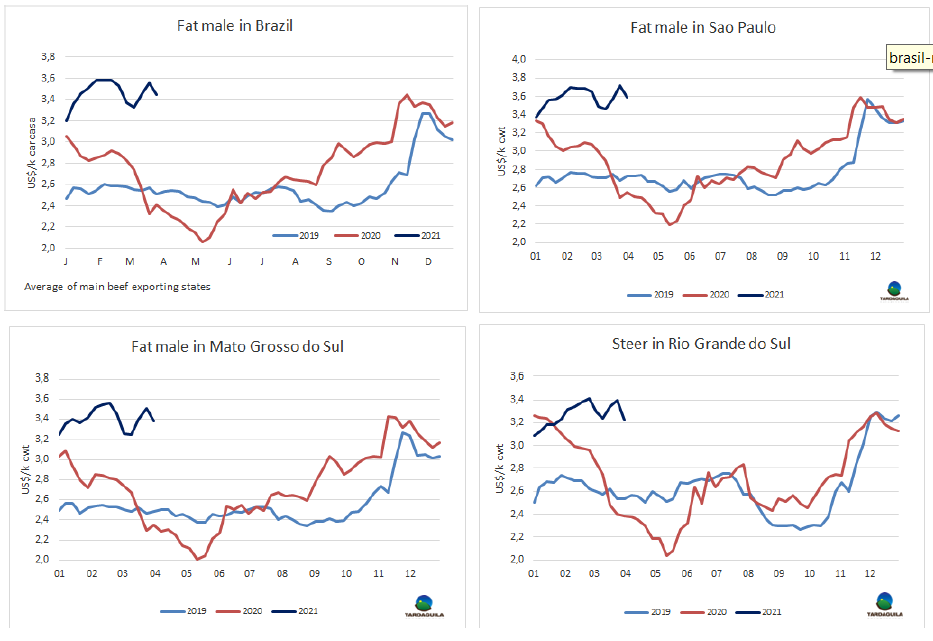 對于疫情發(fā)展的擔憂和巴西內(nèi)閣部長的換屆給巴西貨幣價值造成影響。巴西雷亞爾較美元貶值了4.4%。因此盡管巴西按雷亞爾計的育肥牛價格繼續(xù)上漲,轉(zhuǎn)換成美元價格后本周下跌了11美分至3.45美元/公斤。本周其他地區(qū)牛價保持不變。南方共同市場牛價下降了7美分至3.48美元/公斤。