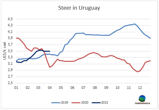 育成閹牛的價格下行持續(xù)時間很短,最近降雨雖然不大,但供應(yīng)端不急出售。參考價與上周相同,特種閹牛3.5美元/公斤,重型母牛3.3美元/公斤,45天付款包含運費。對母牛的采購興趣要強于閹牛,因為母牛的生產(chǎn)主要是面向中國市場,而歐洲市場非常低迷,猶太屠宰團隊也沒有開工。期貨的預定時間在一周左右。烏拉圭新冠病例不斷增長迫使工廠不得不充分利用工作日全面生產(chǎn),因為一旦有工廠發(fā)現(xiàn)新冠病例工廠將停工數(shù)日。由于目前的供應(yīng)相對于需求仍處于短缺狀況,預計復活節(jié)周之后市場將恢復堅挺。