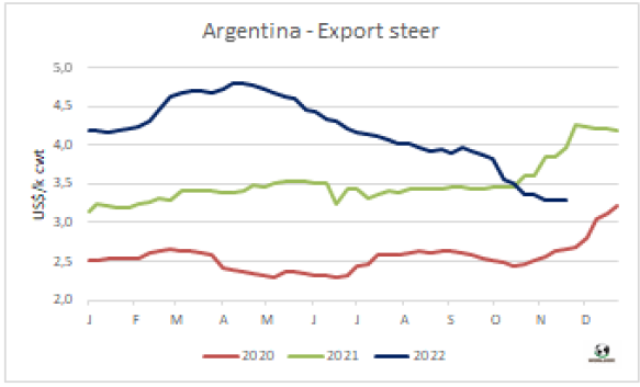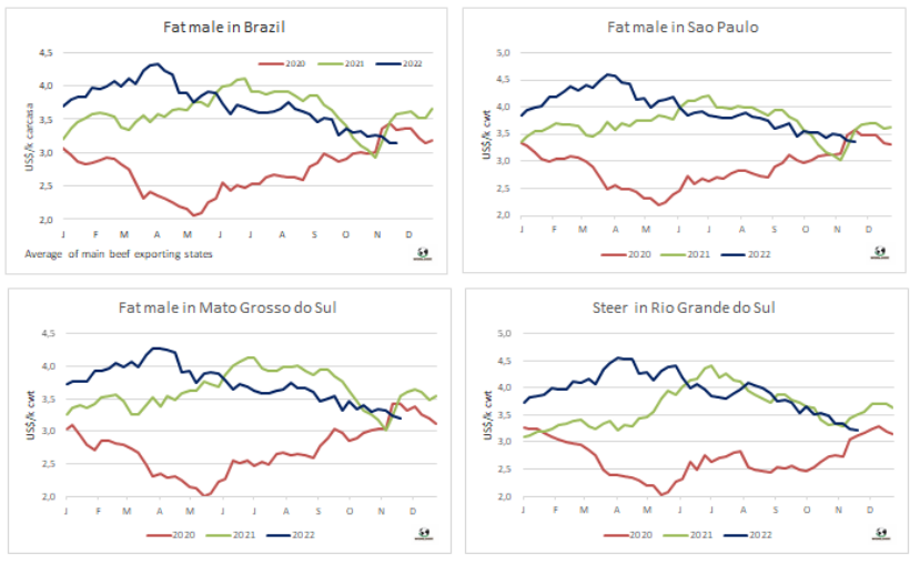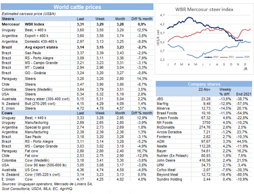 今年下半年,南美國家牛肉價格下跌,但谷物價格仍居高不下。這將導致南美國家減少育肥投入,從而導致2023年前幾個月育肥牛供應下降。烏拉圭集約化養(yǎng)殖者協(xié)會(Aupcin)主席álvaro Ferrés告訴WBR,“有些人開始擔心2023年第一季度供應減少。如果未來幾個月牛價上漲,育肥場的供應狀況可能會改善,”從成本方面來看,由于動物飼料價格仍維持在高位,且雨后預備牛價格穩(wěn)定,預計不會出現(xiàn)大幅下降??紤]到草飼牛的銷售旺盛,直到年中,以及由于缺水而導致的牧草狀況不佳,Ferrés認為“必須進行谷飼育肥才能得到成品牛?!蹦厦赖貐^(qū)其他國家情況也類似。巴西方面,根據(jù)Cepea的說法,“目前的情況不適合圍欄牧場育肥?!卑⒏⒎矫?,“飼料場的現(xiàn)狀很差,”阿根廷育肥場協(xié)會(CAF)主席Fernando Storni告訴WBR。巴拉圭方面,近幾個月來育肥牛價格的暴跌導致飼養(yǎng)場每頭牛虧損100至200美元,因為架子牛的采購價格非常高。作為全球牛肉的主要供應商,南方共同市場在2023年的頭幾個月可能會出現(xiàn)供應減少,特別是牛齡較小的育肥牛。這是一個很重要的信息,因為巴西只能向中國出口屠宰時牛齡小于30個月的牛肉。