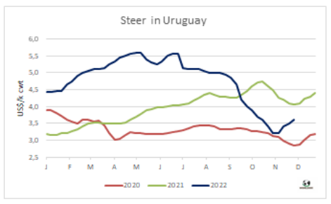 降雨條件的改善進一步使草飼成品牛供應減少,而一些工廠的潔食團隊的到來導致對體重較重的牛需求增加,無論是閹牛還是母牛,供應不足。需求端情況各異,不進行潔食屠宰的工廠保持更謹慎的態(tài)度,但是,盡管出價有點低,他們也在跟隨市場趨勢。周日至周一期間,烏拉圭大部分地區(qū)再次迎來了充沛的降雨,這無疑提高了對夏季降水的預期。重閹牛成交價3.6美元/公斤,對體重較輕的育肥牛需求也有所增長,賣到國內市場的閹牛和小母牛需求增加。從巴西牛肉進口量下降,因此對國內牛肉消費量增加。重母牛報價3.3美元/公斤,預訂活躍,7天交貨。預計市場需求將持續(xù),價格的上漲趨勢得以鞏固,國際市場應該會看到更清晰的漲跌信號。