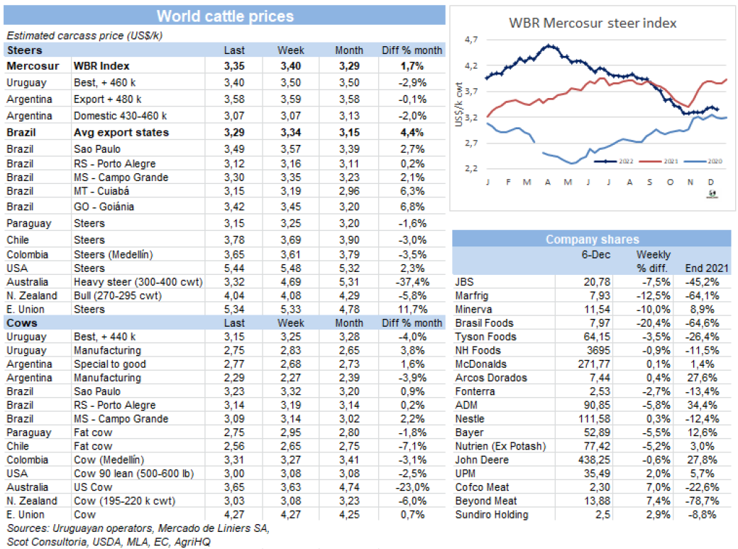 在圣誕季即將到來(lái)之際,智利市場(chǎng)仍有大量庫(kù)存,難以開(kāi)展新業(yè)務(wù)。一位進(jìn)口商認(rèn)為,市場(chǎng)預(yù)計(jì)在1月的第二周重新恢復(fù)。目前的問(wèn)題不是價(jià)格,而是需求。巴西19切圣地亞哥到岸價(jià)為5200美元/噸,巴拉圭19切參考價(jià)5300美元/噸。巴西和巴拉圭牛前參考價(jià)都是4600-4700美元/噸。
