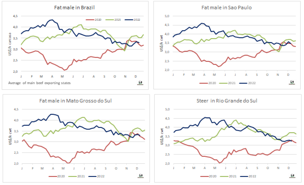 明年受中國(guó)需求減弱和供應(yīng)增加的影響,圣保羅育肥牛價(jià)格將低于今年的水平。預(yù)計(jì)在250-270雷亞爾/15公斤之間波動(dòng)。分析師稱(chēng),明年預(yù)計(jì)牛價(jià)持續(xù)堅(jiān)挺,隨后價(jià)格會(huì)下跌。“一些人認(rèn)為牛價(jià)在頂部會(huì)趨于平穩(wěn),但事實(shí)并非如此。牛周期處于下行階段,2019-2021年期間生產(chǎn)端為提高生產(chǎn)能力進(jìn)行了大量投資。明年年初牧草漲勢(shì)較好將幫助農(nóng)民賣(mài)個(gè)好價(jià)錢(qián),但分析師認(rèn)為這種情況不會(huì)持續(xù)太久,屠宰端為了應(yīng)對(duì)這種情況已經(jīng)開(kāi)始減產(chǎn)。原本幫助抵消國(guó)內(nèi)市場(chǎng)消費(fèi)下降的出口業(yè)務(wù)明年也不會(huì)出現(xiàn)2022年的出色表現(xiàn),因?yàn)橹袊?guó)作為巴西牛肉的主要出口目的地對(duì)進(jìn)口牛肉的依賴(lài)逐步減小。