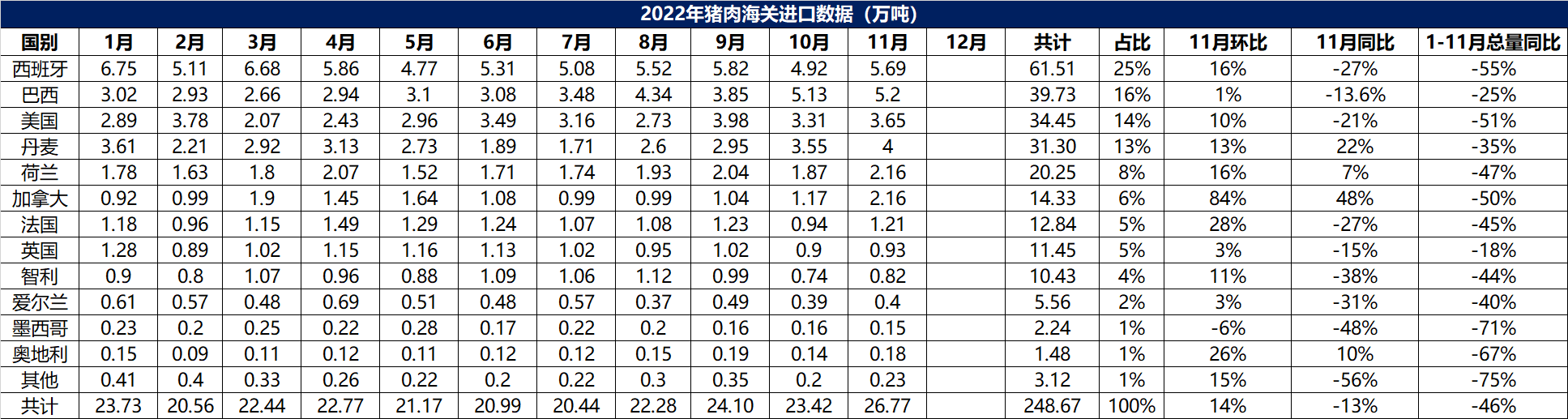 2022年11月中國主港豬肉進口量26.77萬噸,環(huán)比增加14%,同比減少13%。1-11月中國主港豬肉進口量共計248.67萬噸,同比減少46%。