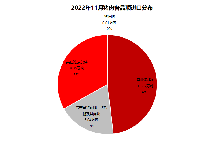 從進口品項看,11月,其他凍豬肉進口量12.87萬噸,占比48%;其他凍豬雜碎進口量8.85萬噸,占比33%。豬主塊肉和豬油脂進口量共計5.05萬噸,占比19%。