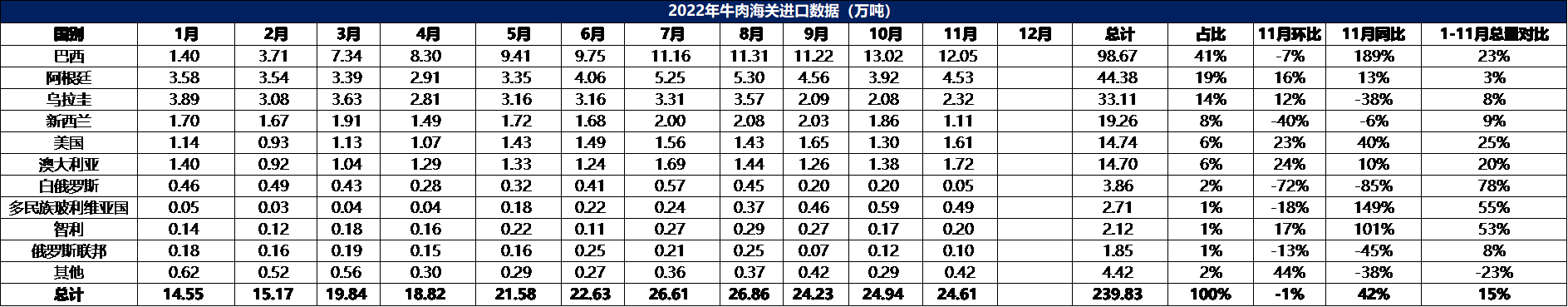 11月中國主港牛肉進口量24.61萬噸,環(huán)比下降1%,同比增長42%。1至11月主港牛肉進口總量239.83萬噸,同比增長15%。