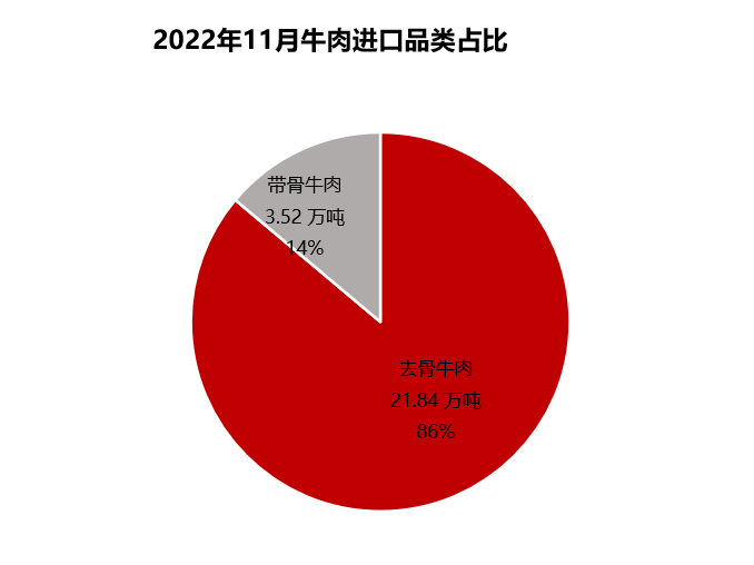 從進口品項看,帶骨牛肉進口量3.52萬噸,占比14%,去骨牛肉進口量21.84萬噸,占比86%。