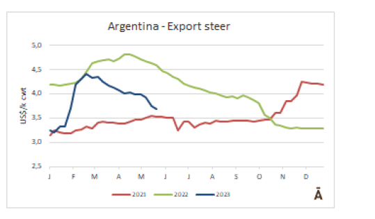 在2023年前四個月,牛肉出口總量為21萬噸(產(chǎn)品重量),價值接近8.95億美元,這一數(shù)字意味著數(shù)量上同比增長13.4%,同時貨值下降17.3%,中國占了發(fā)貨量的77.4%。去年(從2022年5月至2023年4月),肉類出口總量為65.8萬噸產(chǎn)品重量(相當(dāng)于938,500噸帶骨牛肉),價值接近32.73億美元。