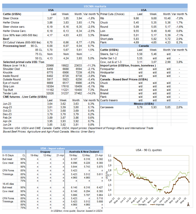 一家經(jīng)營智利市場的代理商的表示智利的進(jìn)口市場仍然疲軟。有一些進(jìn)口商進(jìn)行了 "短期采購",用$5,700(CIF價格)購買了巴西的19分體,用$5,200-$6,000(CIF價格)購買了巴拉圭的19分體。同時,巴西牛前價格為$5,100,巴拉圭牛前為$5,200-5,300,這批貨物將在6月底左右到達(dá)。