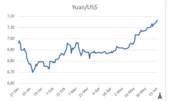 中國市場情況仍然不容樂觀。價格不知道何時會觸底,對于拐點(diǎn)何時到來仍有很大的不確定性。進(jìn)口牛肉市場持續(xù)下調(diào)。另一個使市場情況變得復(fù)雜化的因素是人民幣的貶值。人民幣在上周貶值0.7%,在過去五個月累計(jì)貶值6.9%,使進(jìn)口產(chǎn)品在成本更高。另一方面,央銀行宣布將短期利率從2.0%降至1.9%后,意味著政策性降息啟動,預(yù)計(jì)該趨勢將進(jìn)一步加劇。