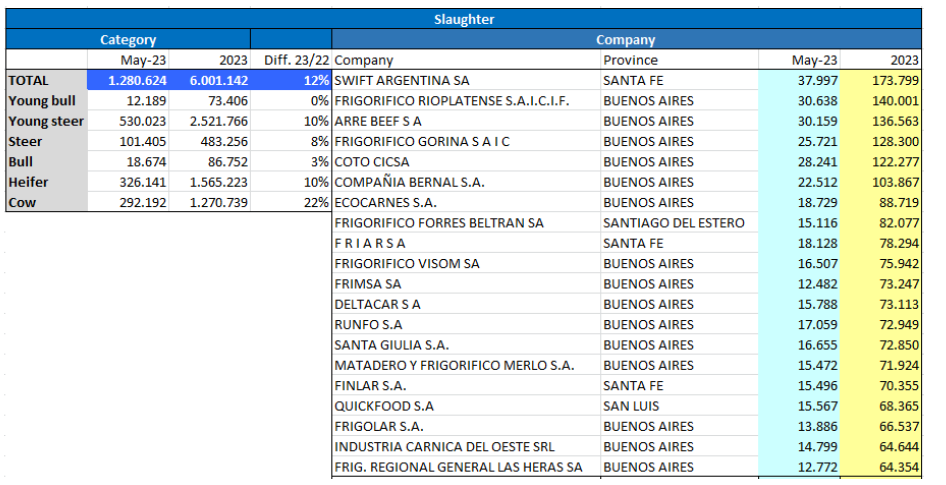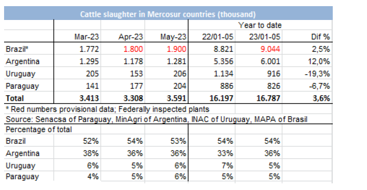 根據(jù)官方數(shù)據(jù)顯示5月份屠宰了128萬頭牛,比上個月增長了近9%,年度增長率略高于10%。按工作日計(jì)算,5月份的屠宰量超過去年4月份總量的3%,比2022年5月的屠宰量高出16%。雖然在這兩方面的比較中都有增長,特別是同比增長,但與上個月相比有所下降,當(dāng)時日屠宰量在每月比較中增長11%,同比增長18%。在2023年的前五個月,牛的屠宰量超過了2022年同期。今年共有600萬頭牛被屠宰,比去年同期多12%。