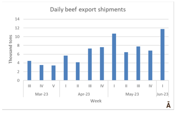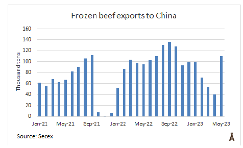 南方共同市場5月份向中國出口了約17.5萬噸牛肉,比4月份多出近8萬噸。反過來,來自大洋洲的出貨量為4萬噸,是三年來最高的月度貨運(yùn)量,比4月份增加了6.5萬噸。