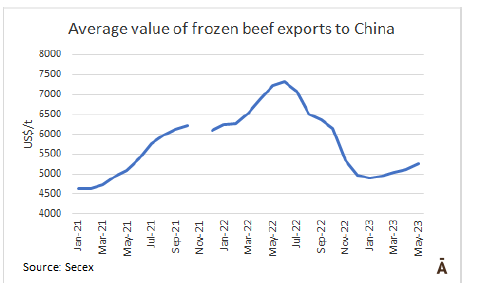 巴西對華牛肉出口量不再受非典型瘋牛病暫停的影響后,在5月份飛升,數(shù)據(jù)顯示,5月份有110,988噸牛肉運(yùn)往中國,環(huán)比增長7萬噸,是自去年10月以來的最高月出口量。均價也有所增加為$5255/噸,環(huán)比增長2.8%。5月均價為$5255/噸,環(huán)比增長2.8%,連續(xù)四個月保持上升趨勢。