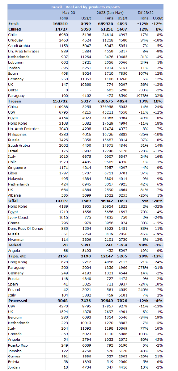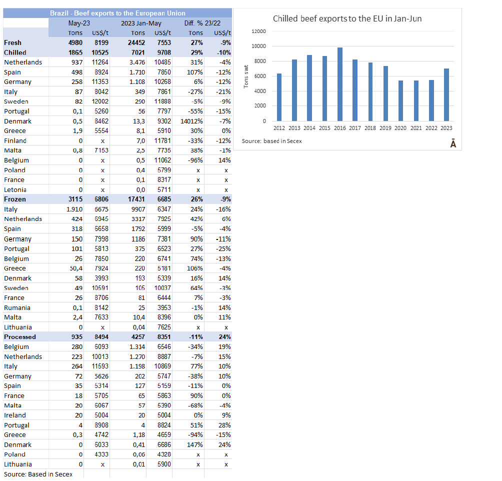 2023年以來巴西對歐盟的牛肉出口量大幅增加,這與國外總銷量的情況相反。在1-5月期間,巴西出口了24452噸鮮牛肉,比2022年同期多27%;冰鮮(增長29%)和冷凍(增長26%)的出口都有所增加。荷蘭在巴西鮮牛肉出口中占主導(dǎo)地位,其次是西班牙,而意大利在巴西冷凍牛肉出口中基本占主導(dǎo)地位,是總數(shù)量的57%。