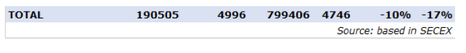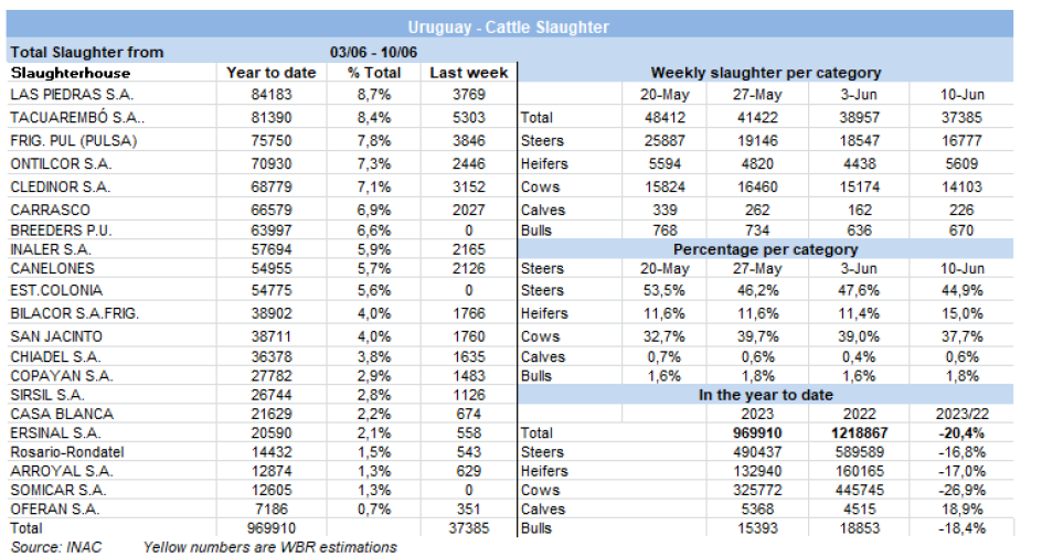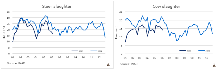 屠宰量前三的工廠是是12廠(5303頭)、7廠(3846頭)和379廠(3769頭)。Marfrig有三個比較活躍的工廠,共屠宰了10,620頭牛,而Minerva也有三個工廠,共屠宰了7999頭牛。到目前為止,6月份已經(jīng)屠宰了54,011頭牛,比2022年同期減少33%。