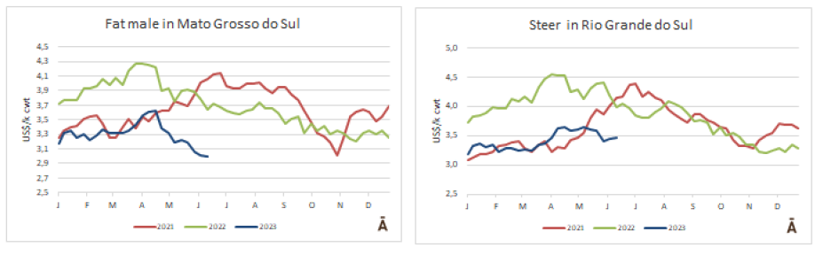 自4月初以來,主要出口州的成品牛價格下跌18%,從R$/@258下降到R$/@211。本周已經(jīng)是連續(xù)第十次下跌。
