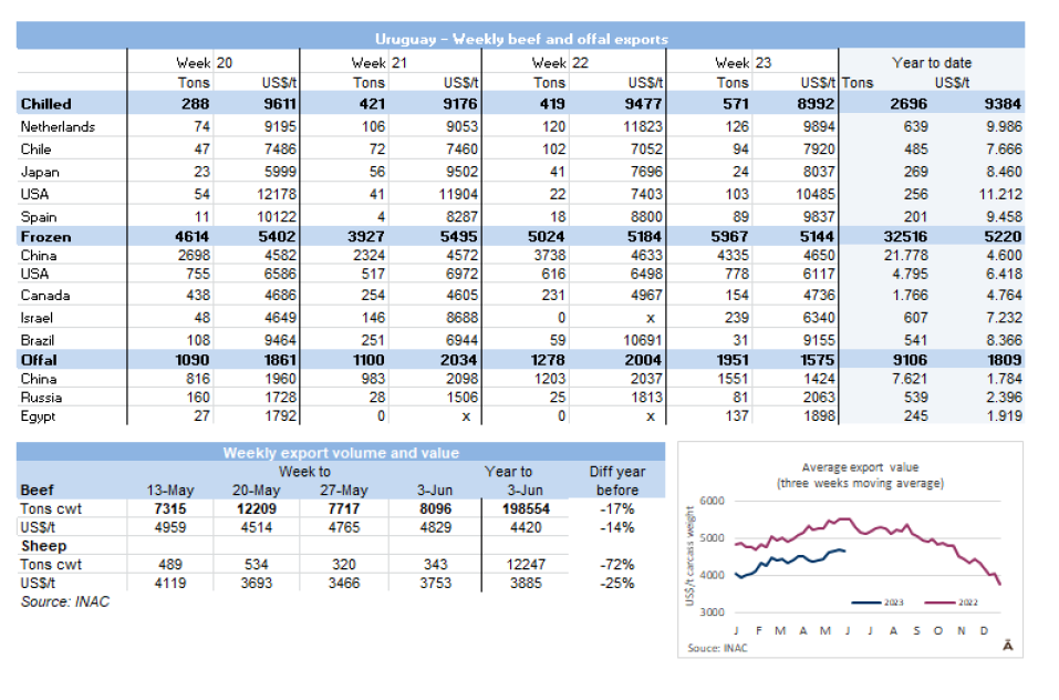 與該地區(qū)其他國家相比,烏拉圭簽訂運(yùn)往以色列的常規(guī)猶太屠宰合同的可能性一直很低,因?yàn)樾枰Ц遁^高的原料價格。然而在上周,一些進(jìn)口商完成了飼養(yǎng)牛的交易,因?yàn)閮?yōu)質(zhì)草食動物的供應(yīng)非常有限。一位市場人士說他們正在談判,一些阿根廷工廠已經(jīng)停止了每噸$8000的FOB報(bào)價。