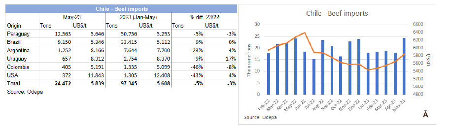 2023年前5個月智利進(jìn)口了97345噸,均價$5608/噸;數(shù)量同比下降5%,中值收縮3%。