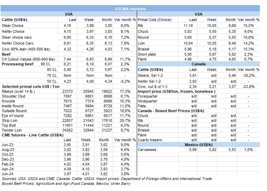 作為美國牛肉和各種肉類的主要目的地,墨西哥匯率和強(qiáng)勁的餐飲服務(wù)需求推動了4月份的出口總量達(dá)到14403公噸,比2022年增長10%,而價值增長18%,達(dá)到8180萬美元。2023年前四個月對墨西哥的出口增長14%,達(dá)到64,912公噸,價值為3.654億美元(增長17%)。