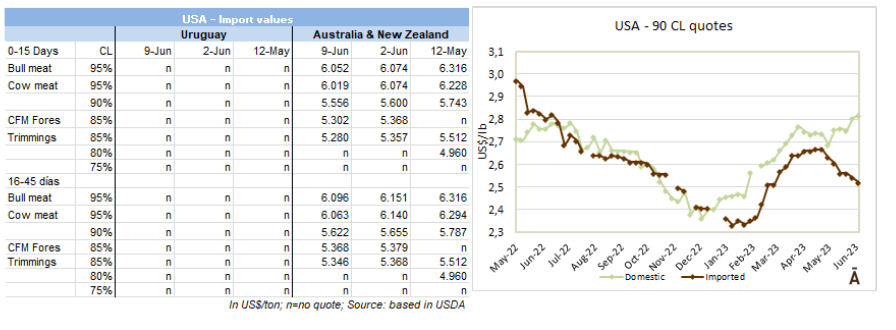 一位烏拉圭出口商說好消息是美國國內(nèi)的價格很高。壞消息是澳大利亞整極力向美國運(yùn)送超過其40萬噸的免稅配額的出口量。鑒于中國幾周來市場表現(xiàn)出的疲軟狀態(tài),美國的市場越來越有優(yōu)勢。美國出的CFR參考價格為牛霖$5300-$5400,砧扒$5900,大米龍$5700。美國的出價要比中國的出價更有吸引力。而問題在于烏拉圭每年只有2萬噸的免稅配額。美國出的CFR價95CL牛前(支付26.4%的關(guān)稅)$4300,90CL牛前$4000-$4100,85CL牛前$3950。這些出價也比中國高,盡管需求不是很大。消息人士說屠宰量低的情況下,美國的出價很有吸引力。