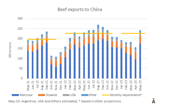 據(jù)估計(jì),5月份約有24萬噸牛肉運(yùn)往中國,這一數(shù)量將超過他們每月的需求量(估計(jì)為22.5-23萬噸)。自去年10月以來,出貨量一直低于需求量。