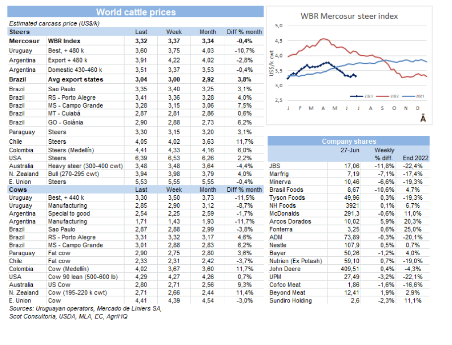 巴拉圭的情況正好相反,價(jià)格上漲了15美分,達(dá)到美元3.30/公斤。巴西是該地區(qū)價(jià)格最低的國家,但價(jià)格也在上漲。本周,主要出口國的育肥牛平均價(jià)值上漲4美分,達(dá)到$3.04/公斤。因此,南方共同市場(chǎng)小牛指數(shù)本周下跌5美分,至$3.32/公斤。